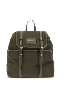 Nylon-Rucksack mit Überschlag und Vordertasche, verstellbaren Riemen mit Schnallen und Ösen. Ein Metalllogo mit Schriftzug verleiht ihm einen markanten urbanen Touch.