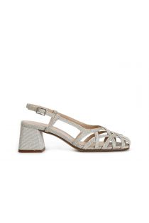 Offene schuhe aus lurex-stoff mit asymmetrischem gewebtem gitter. abgerundete schuhform. schnürung hinten. 45 mm hoher absatz. sehr bequem perfekt für den täglichen gebrauch.