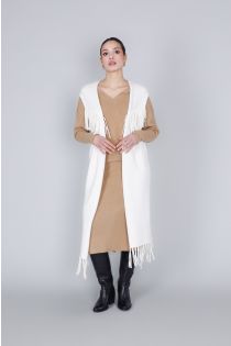 Oversize-Weste mit Fransenmuster aus weichem Viskose-Mischgewebe. Ideal für einen lässigen Look. Perfekt zum Kombinieren mit Pullovern und Kleidern für einen vielseitigen Style. Das Model ist 174 cm groß und trägt Größe S.