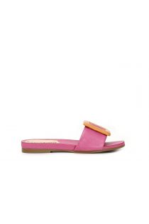 Pantoletten aus weichem Nappaleder mit besonderer eckiger gepolsterter Schlaufe, die als Accessoire dient. Bequemes Fußbett.