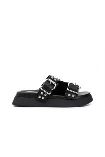 Pantoletten mit doppelter Schnalle mit eckigen facettierten Nieten, bequemem Fußbett und dicker Sohle.