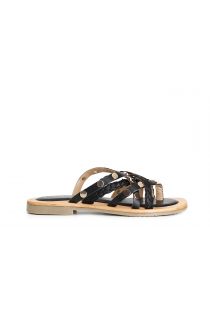 Flache sandalen im pantoffelstil mit abwechselnden leder- und bastriemen die mit goldenen nieten verziert sind.