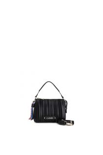 Plissierte pochette aus weichem material mit geflochtenem griff personalisierter plakette an der vorderseite und kordelanhänger mit farbigen fäden mit optionalem schulterriemen.
