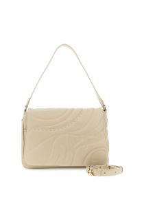 Gesteppte und gepolsterte Klappentasche aus Kunstleder mit Ziernieten. Kurzer Schulterriemen und abnehmbarer Schulterriemen mit Karabinerhaken.