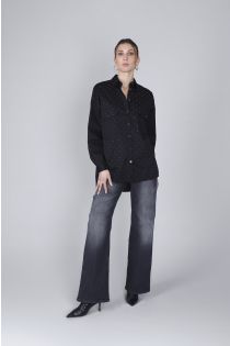 Bequemes Hemd aus elastischem Baumwollpopeline mit Mikronieten auf der Vorderseite. Lange Ärmel und aufgesetzte Taschen. Das Model ist 173 cm groß und trägt Größe S.