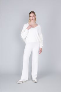 Pullover mit V-Ausschnitt und Fransen vorne aus warmem Viskose-Mix. Perfekt für einen lässigen und bequemen Look, normale Passform. Das Model ist 174 cm groß und trägt Größe S.