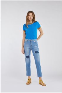 Pullover mit halblangen Ärmeln aus Viskosegarn in Rippverarbeitung. Der Ausschnitt und der Ärmelabschluss sind mit einem zarten Muster aus Kontraststreifen verziert, das die Attraktivität des Stücks erhöht.