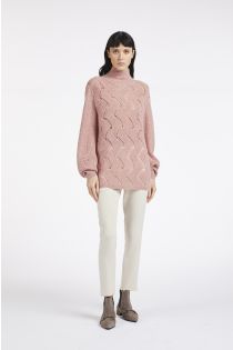 Eleganter Pullover mit hohem Kragen und Lochmuster sowie weiten Ärmeln aus Angoramischgarn.
