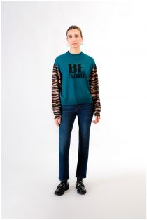 Kurzer pullover mit bikerkragen aus warmem und weichem wollmischgarn. stockinettenstich und jacquard-verarbeitung für unseren „be noir“-slogan verziert mit fachmännisch applizierten strasssteinen. erhältlich in einer zweifarbigen variante mit bedruckten ärmeln.