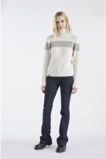 Warmer, gemütlicher Pullover mit Rollkragen aus Angoragemisch mit Lurex-Einsatz und einer farblichen Teilung in drei breite Querstreifen, die über das ganze Stück verlaufen.