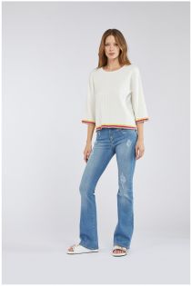 Weiter Pullover mit U-Boot-Ausschnitt aus Viskosegarn in Rippverarbeitung. Der Abschluss und der Ärmelrand sind durch ein zartes Muster aus Kontraststreifen verziert, das die Attraktivität des Stücks erhöht