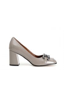 Glamouröser pumps mit quadratischer spitze verziert mit einer spange aus metall. 75 mm breiter absatz. innensohle aus leder. perfekter schuh für alle gelegenheiten
