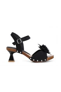 Rauleder-sandalen mit 3d-blume und knöchelriemen. farblich zum riemen passender latino-absatz.