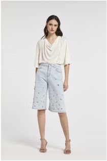Jeans-bermudahose in regular-passform aus komfort-gewebe. edle strassapplikation vorn