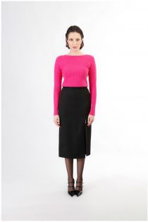 Midirock aus polyviskose-stoff. der rock hat einen deutlichen seitenschlitz mit einem dekorativen schrägen reißverschluss.
