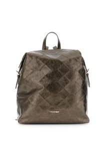 Rucksack aus weichem, metallisch schimmerndem Kunstleder mit geometrischer Stickerei auf der Vorderseite, verstellbaren Schultergurten, flacher Rückentasche und quadratischen Schnallen. Elegante Metallbeschriftung.