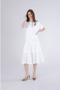 Dieses leichte und feminine midikleid aus lochstickerei besticht durch kurze ärmel und rüschen. die filigrane stickerei betont die silhouette und macht es ideal für elegante sommer-looks lässig-elegante outfits oder anlässe am tag. das model ist 171 cm groß und trägt größe s. passform: normal.