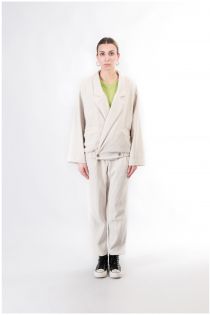 Übergroße bluse mit zweireihiger knopfleiste unten. aus rock-samt. elegante blumenbrosche am revers. kombinierbar mit hosen aus dem gleichen stoff.