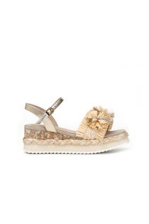 Sandalen aus gefranstem Bast auf Keilsohle mit 55 mm Höhe aus mehreren Materialien.