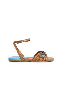 Flache ledersandalen mit knöchelriemchen und zweifarbiger verzierung auf der vorderseite die an ein blattgeflecht erinnert.
