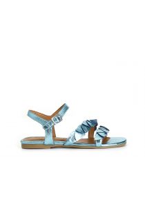 Flache sandalen aus laminiertem leder mit doppeltem riemen modell gilda mit knöchelriemchen. vorderseite mit dekoration die an ein blättergeflecht erinnert.