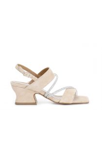 Franziskanersandalen mit zwei raulederriemen und zwei mikrostrass-bändern. dicker trichterabsatz.