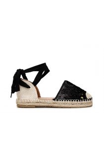 Sandalen aus Stoff mit Pailletten und Bändchen am Knöchel auf flacher Hanfsohle