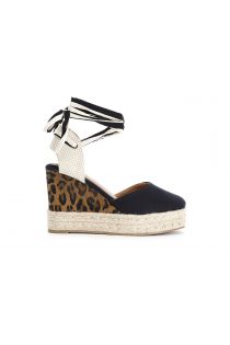 Canvas-sandalen mit doppelter römerschnürung und keilsohle aus hanf stoff mit leopardenprint.