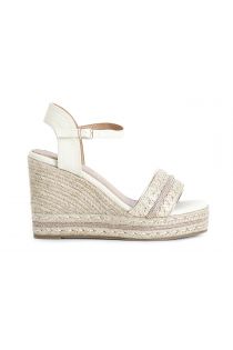 Sandalen modell gilda aus raffiabast mit mikrostrass-einsatz. keilsohle aus hanf mit einem streifen aus mikro-strasssteinen verziert.