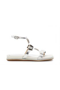 Sandalen mit Accessoires in eckiger Form aus Metall in demselben Farbton wie der Oberschuh. Besonderes Detail: der mit Glitter besetzte, abgeschrägte Rahmen.