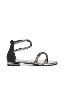 Sandalen mit heißversiegelten strasssteinen. patch und reißverschluss auf der rückseite. futter und innensohle sind aus leder. der absatz beträgt 1.6 cm.