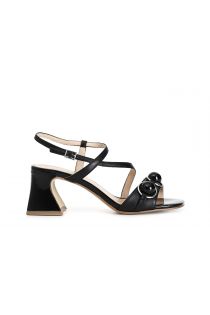 Sandalen mit band aus nappaleder und accessoire mit drei kugeln. ein schuh der dank seines 55 mm hohen breiten absatzes und seines bequemen fußes den ganzen tag lang getragen werden kann.