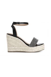 Sandalen mit strassbändern auf seilkeilsohle und plateau. knöchelriemchen.