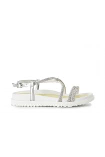 Asymmetrische sandalen mit strassbesetzten riemen und ledersohle auf bequemem fußbett.