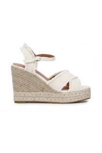 Sandalen mit Überkreuzung aus ausgefranstem Stoff auf Hanf-Keilsohle mit 90 mm Höhe