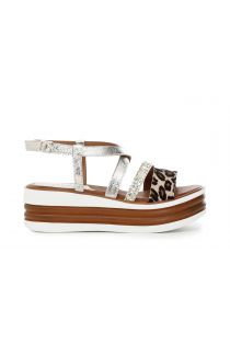 Sandalen mit Überkreuzung aus Glitter und Cavallino-Leder auf zweifarbiger Keilsohle