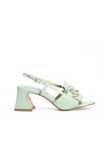 Sandalen wildleder und nappaleder mit fransen mit schmuckkette. ein schuh der dank seines 55 mm hohen breiten absatzes und seines bequemen fußes den ganzen tag lang getragen werden kann.
