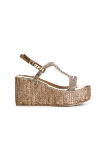 Sandaletten mit doppeltem band strassmotiv. keilschuh mit bast.