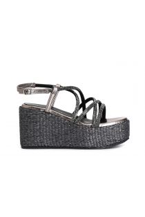 Sandaletten mit verkreuzt verlaufenden strassbändern und knöchelriemchen mit schnalle. keilschuh mit bast.