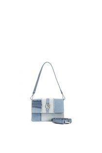 Umhängetasche mit überschlag aus jeansfransenstoff-patchwork. metall-logo mit strasssteinen. tasche mit schulterriemen.
