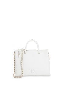 Tragetasche mit röhrenförmigen griffen. logo-prägung und ton-in-ton-accessoire. rreißverschlusszug mit anhänger. inklusive schulterriemen mit kette.