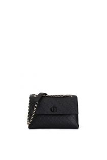 Umhängetasche mit überschlag. logo-prägung und ton-in-ton-accessoire. kettenförmiger schultergurt. rreißverschlusszug mit anhänger.