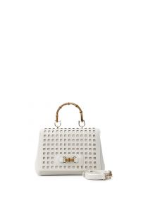 Handtasche mit laserperforiertem überschlag. griff und horsebit aus echtem bambus. einzelnes fach. doppelter magnetverschluss. tasche mit schulterriemen.