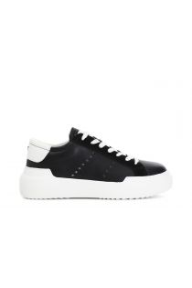 Damen-sneaker mit glitzer- und spiegelelementen an der schuhspitze und gemusterter schnürung. die innensohle ist aus leder gefertigt.