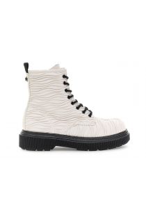 Damen-Schnürstiefeletten aus plissiertem Kunstleder mit acht Ösen und innenliegendem Reißverschluss. Textilfutter und robuste 4 cm Sohle. Originelles Design für urbane Looks.