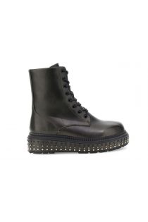 Schnürstiefeletten aus gebürstetem Metallic-Kunstleder mit Lederinnensohle und Plateausohle, verziert mit goldenen und schwarzen Nieten. 3,5 mm Sohlenhöhe. Markantes und modernes Design.