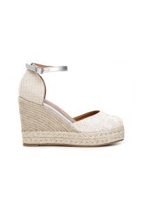 Schuhe mit Bändchen aus Stoff in Spitzenoptik am Knöchel auf Hanf-Keilsohle mit 90 mm Höhe
