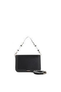 Umhängetasche mit klappe verziert mit zweifarbigen mininieten und kontrastierenden rippen. ausgestattet mit reißverschlusstrennwand kurzem schultergurt mit schulterpolster und abnehmbarem schultergurt.