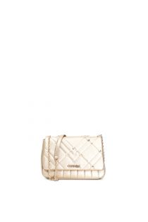 Schultertasche mit Patte und Steppnähten mit pyramidenförmigen Ziernieten an den Punkten, in denen sich die Nähte kreuzen. Durch Verlängern der Kette auch als Umhängetasche nutzbar