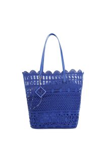 Shopper aus spitze mit passendem innenbeutel aus baumwolle. griffe in lederoptik und ton-in-ton-anhänger. perfekt um jedem sommerlook farbe zu verleihen.
